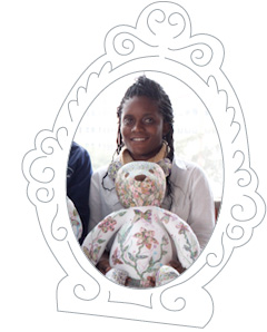 In Zimbabwe, Juliet used to buy and sell wood. At Taunina, she embellishes our handmade collectable soft toys with exquisite embroidery and appliqué designs. This beautiful teddy bear, Tafadzwa (which means ‘we are happy’), took her five days to create and carries with it the wish of ‘happiness’. A stunning composition of azure blue tints adorn its body in motifs inspired by a secret garden of chirping birds, fluttering butterflies, and budding blooms.